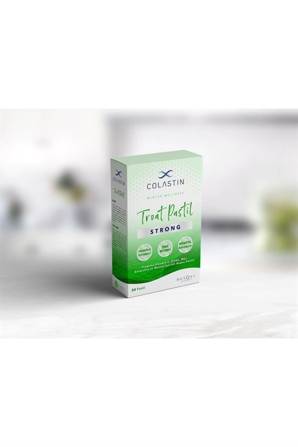 ÜRÜN BİLGİSİ Pastil şeklinde üretilen Colastin Strong, çiğneme ve emme yoluyla ağız içinde çözünebilir özelliğe sahiptir. Bitkisel formülasyonu ile boğazınızın rahatlamasına yardımcı olur. ; Ürünün bir paketinde 24 adet pastil bulunur. ; Kullanım Bilgileri 11 yaş ve üzeri bireylerde günde 2-4 adet pastile kadar ağızda emilerek kullanılması tavsiye edilir. ;